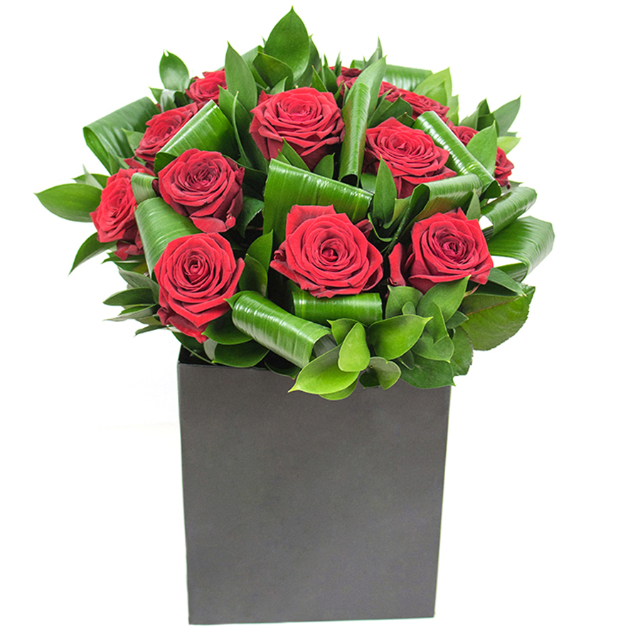 Add a touch of elegance to your living space with our beautiful bouquet, featuring vibrant red roses, lush aspidistra leaves, and pristine ruscus. This unique combination ensures a striking and sophisticated display.